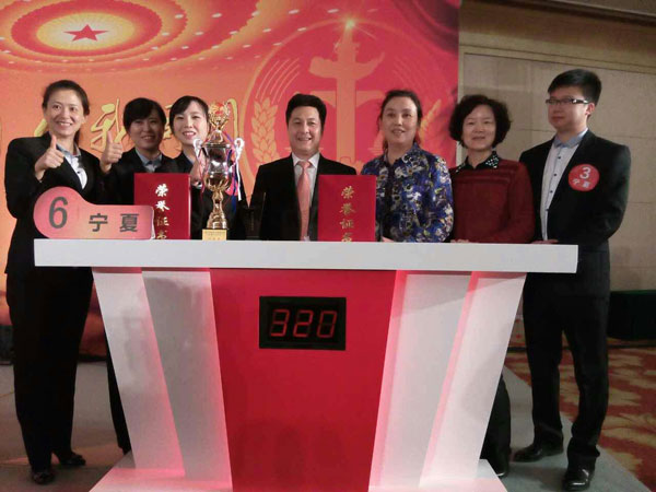 宁夏侨联代表队经过激烈角逐,一路过关斩将,沉着应战,遥遥领先,摘得桂冠,获得本次大赛第一名。宁夏侨联法顾委委员贺倩因法律功底深厚、临场表现优秀,被授予“个人表现突出奖”。中国侨联领导为获奖队伍和获奖队员颁发了奖杯和证书。 赛前,宁夏侨联领导高度重视,及时召开会议,就如何开展工作进行了深入细致地研究、部署,成立了以常务副主席为主任的竞赛领导小组。我们将法律知识竞赛题库印制成册,发放到每位队员手中。队员们齐心协力、一丝不苟,加班加点、认真备战?;崃斓级啻窝屎凸匦亩釉钡淖急盖榭?,鼓励大家要满怀信心,展现风采,努力拼搏,争创佳绩。 全国政协副主席、致公党中央主席万钢,中国侨联主席林军,中国侨联法顾委主任张耕,司法部副部长、全国普法办副主任张彦珍,全国人大华侨委委员张余亭,国务院侨办副主任何亚非,全国政协港澳台侨委副主任刘凡,中国侨联副主席董中原、李卓彬、朱奕龙,中国侨商会副会长王永乐,法顾委常务副主任孙琬钟、林淑娘等领导和各省、自治区、直辖市侨联代表等共300余人在现场观看了激烈的比赛。
