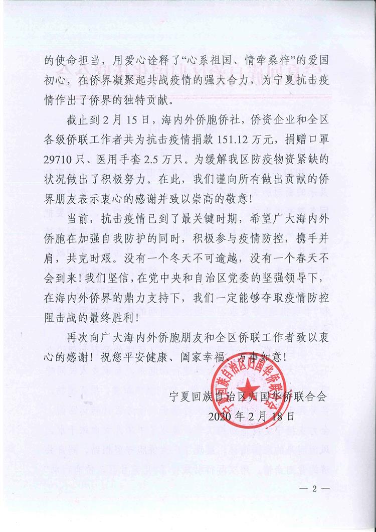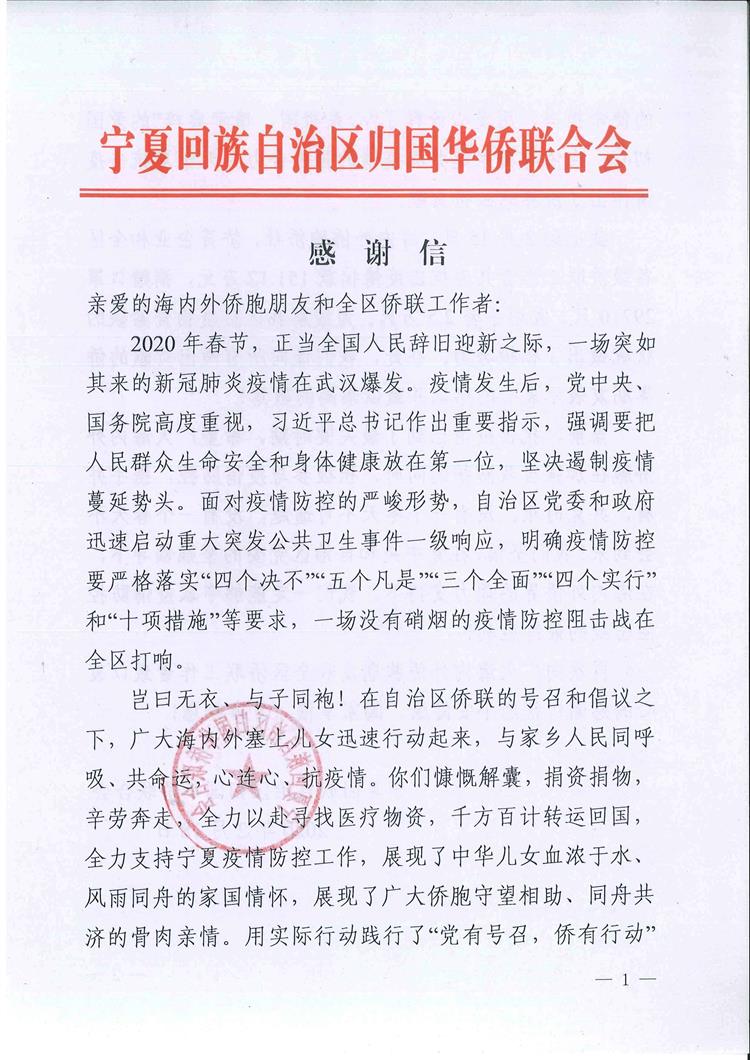 宁夏侨联致海内外侨胞和全区侨联工作者的感谢信