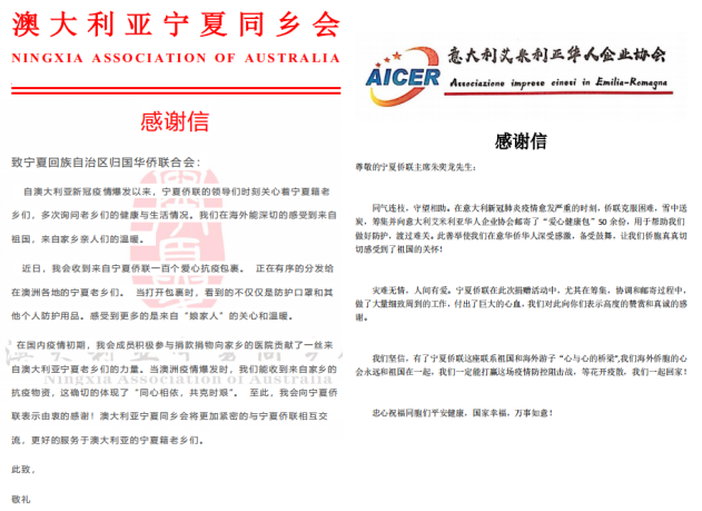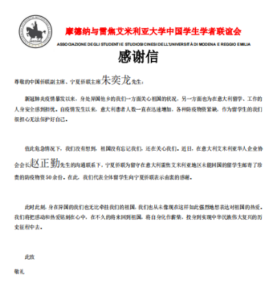 .jpg) 意大利艾米利亚华人企业协会赵正勤会长代表在意广大侨胞和留学生致宁夏侨联的信中表示,“同气连枝,守望相助。在意大利新冠肺炎疫情愈发严重的时刻,侨联克服困难,雪中送炭,筹集并向意大利艾米利亚华人企业协会邮寄了‘侨爱心健康包’50 余份,用于帮助我们做好防护,渡过难关。此善举使我们在意华侨华人深受感激,备受鼓舞,让我们侨胞真真切切感受到了祖国的关怀!”