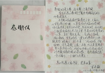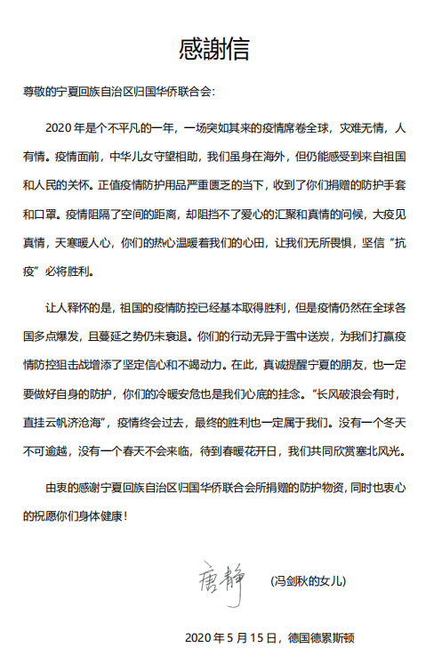 .jpg) 德国德累斯顿留学生唐静在来信说:“疫情面前,中华儿女守望相助,我们虽身在海外,但仍能感受到来自祖国和人民的关怀。正值疫情防护用品严重匮乏的当下,收到了你们捐赠的防护手套和口罩。疫情阻隔了空间的距离,却阻挡不了爱心的汇聚和真情的问候,大疫见真情,天寒暖人心,你们的热心温暖着我们的心田,让我们无所畏惧,坚信抗疫必将胜利。”?