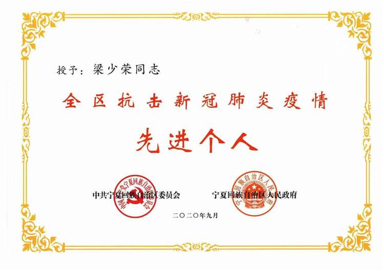 归侨、宁夏荣光科技集团董事长——梁少荣,着眼全区疫情防控大局,辗 转国外采购并向区内捐赠N95医用口罩2万多只,他还充分发挥科技企业优势,紧 急转产紫外线杀菌灯等防疫科技产品,全部捐赠给区内抗疫一线,有力支援了 家乡疫情防控。他本人荣获宁夏回族自治区“全区抗击新冠肺炎疫情先进个人” 称号。