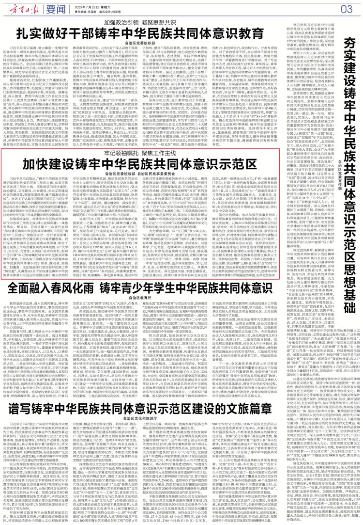 习近平总书记指出,“铸牢中华民族共同体意识是新时代党的民族工作的主线,也是民族地区各项工作的主线。民族地区的经济建设、政治建设、文化建设、社会建设、生态文明建设和党的建设等,都要紧紧围绕、毫不偏离这条主线”。全区上下认真学习贯彻习近平总书记关于加强和改进民族工作的重要思想和视察宁夏重要讲话指示批示精神,按照自治区党委的部署要求,加快建设铸牢中华民族共同体意识示范区,奋力打造新时代民族工作高质量发展的全国典范。