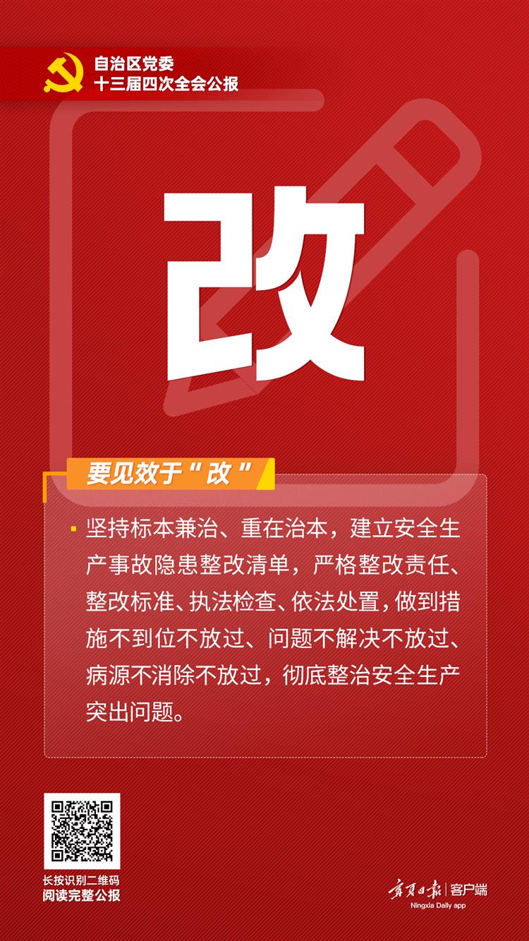 | | 自治区党委十三届四次全会精神“一字一意”③|要见效于“改” | | 来源:宁夏日报客户端 发布时间:2023-08-17 | 【编者按】7月26日至27日,自治区党委十三届四次全会在银川举行。此次全会是自治区成立以来第一次以安全生产为主题的党委全会。即日起,宁夏日报客户端推出“系列海报”全会精神“一字一意”,带您一起深入学习此次全会的主要精神。自治区党委十三届四次全会指出:坚持人民至上、生命至上,坚持预防为主、源头防范,坚持系统观念、综合治理,坚持深化改革、强化法治,坚持各负其责、齐抓共管。 按照“所有事”全领域覆盖、“一件事”全链条管控、“落实事”全过程监管,坚决打好安全生产主动仗、总体仗、攻坚仗、作风仗,以治本之举、长远之策护佑百姓安宁安康、保障宁夏长治久安。