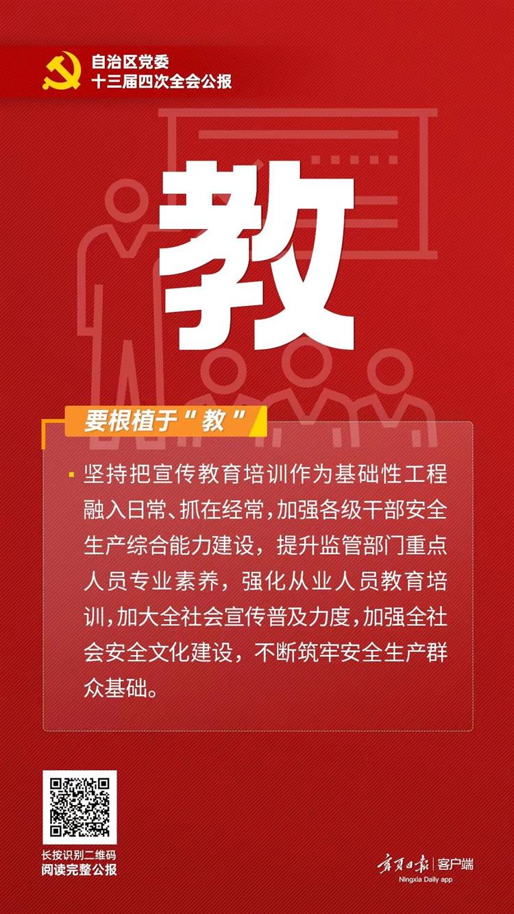 【编者按】 7月26日至27日,自治区党委十三届四次全会在银川举行。此次全会是自治区成立以来第一次以安全生产为主题的党委全会。即日起,宁夏日报客户端推出“系列海报”全会精神“一字一意”,带您一起深入学习此次全会的主要精神。 自治区党委十三届四次全会指出:坚持人民至上、生命至上,坚持预防为主、源头防范,坚持系统观念、综合治理,坚持深化改革、强化法治,坚持各负其责、齐抓共管。 按照“所有事”全领域覆盖、“一件事”全链条管控、“落实事”全过程监管,坚决打好安全生产主动仗、总体仗、攻坚仗、作风仗,以治本之举、长远之策护佑百姓安宁安康、保障宁夏长治久安。