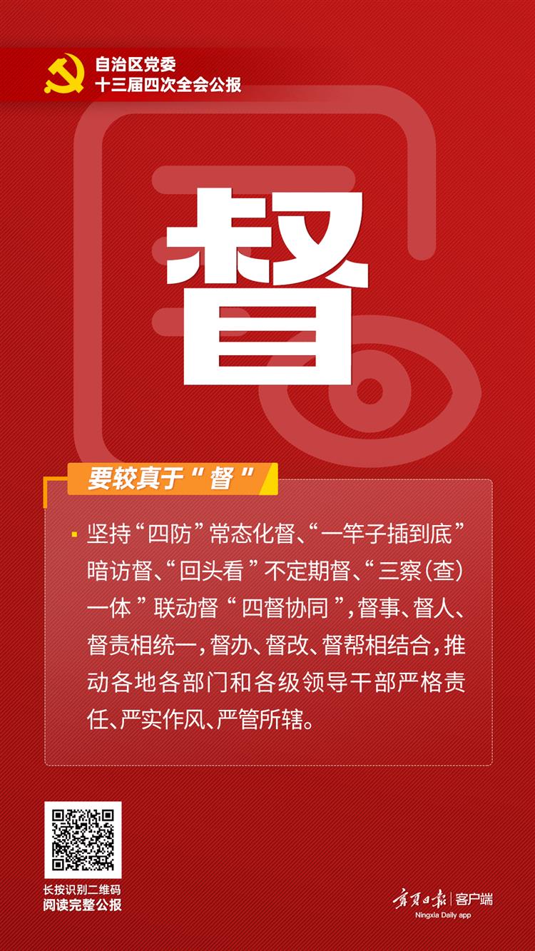 | | 自治区党委十三届四次全会精神“一字一意”⑧|要较真于“督” | | 来源:宁夏日报客户端 发布时间:2023-08-28 | 【编者按】