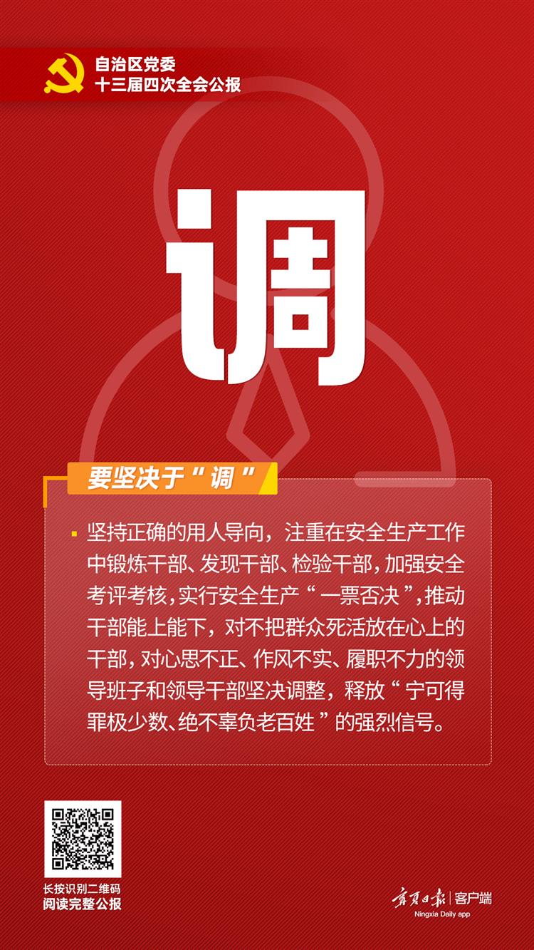| | 自治区党委十三届四次全会精神“一字一意”⑨|要坚决于“调” | | 来源:宁夏日报客户端 发布时间:2023-08-30 | 【编者按】7月26日至27日,自治区党委十三届四次全会在银川举行。此次全会是自治区成立以来第一次以安全生产为主题的党委全会。即日起,宁夏日报客户端推出“系列海报”全会精神“一字一意”,带您一起深入学习此次全会的主要精神。自治区党委十三届四次全会指出:坚持人民至上、生命至上,坚持预防为主、源头防范,坚持系统观念、综合治理,坚持深化改革、强化法治,坚持各负其责、齐抓共管。 按照“所有事”全领域覆盖、“一件事”全链条管控、“落实事”全过程监管,坚决打好安全生产主动仗、总体仗、攻坚仗、作风仗,以治本之举、长远之策护佑百姓安宁安康、保障宁夏长治久安。