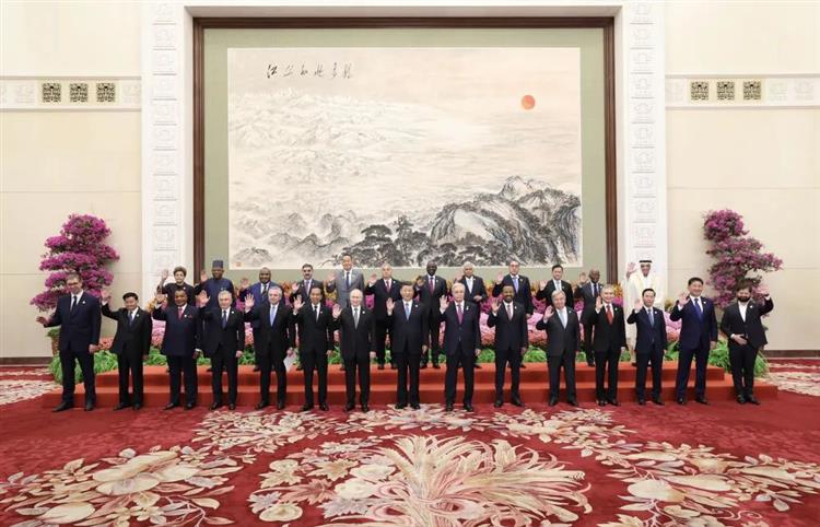 10月18日上午,国家主席习近平在北京人民大会堂出席第三届“一带一路”国际合作高峰论坛开幕式并发表题为《建设开放包容、互联互通、共同发展的世界》的主旨演讲。这是会前,习近平同出席高峰论坛的外国国家元首、政府首脑和国际组织负责人等国际贵宾集体合影。新华社记者 申宏 摄 习近平同出席开幕式的外方领导人集体合影。 在《和平-命运共同体》乐曲中,习近平同外方领导人一同步入会场。全场起立热烈欢迎。