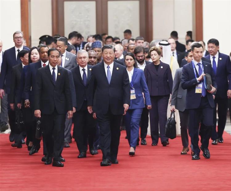 10月18日,国家主席习近平在北京人民大会堂出席第三届“一带一路”国际合作高峰论坛开幕式并发表主旨演讲。这是习近平同国际贵宾步入会场。新华社记者 王晔 摄 习近平主席发表题为《建设开放包容、互联互通、共同发展的世界》的主旨演讲。