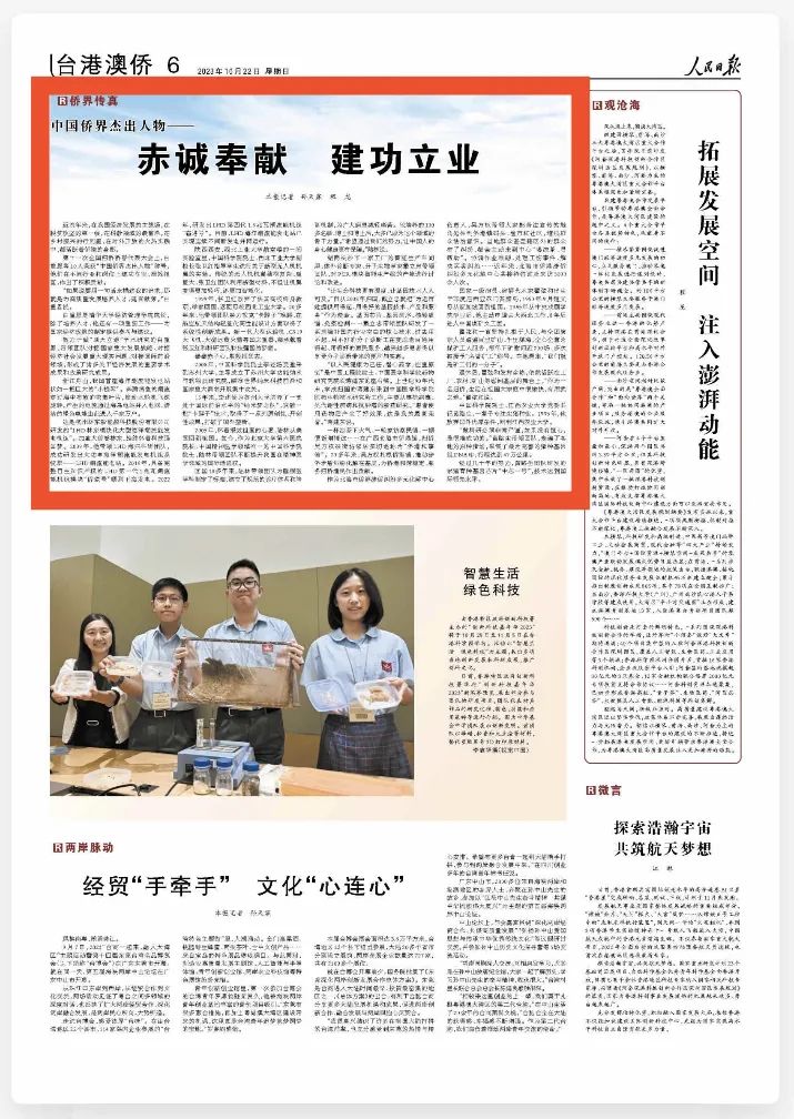 10月22日出版的《人民日报》刊发题为《中国侨界杰出人物——赤诚奉献 建功立业》文章,全文如下。 近些年来,在我国经济发展的主战场,在脱贫攻坚的第一线,在科教领域的最前沿,在乡村振兴的行列里,在对外开放的火热实践中,都活跃着侨胞的身影。 第十一次全国归侨侨眷代表大会上,白重恩等10人荣获“中国侨界杰出人物”称号,他们在不同行业和岗位上建功立业、报效祖国,作出了积极贡献。 “如果说要用一句话来描述我的追求,那就是为高质量发展培养人才,建言献策。”白重恩说。 白重恩是清华大学经济管理学院院长,除了培养人才,他还有一项重要工作——为国家经济政策的制定提供参考与建议。 致力于做“顶天立地”学术研究的白重恩,带领团队对接国家重大发展战略、对接经济社会发展重大现实问题、对接国际前沿领域,形成了诸多关于经济发展的重要学术成果和政策研究成果。 浙江舟山,我国首座海洋潮流能发电站状如一把巨大的“小提琴”。奔腾湍急的潮流穿过海中布放的密集叶片,推动水轮机飞速旋转,产生的电流通过海岛电站并入电网,清洁的绿色电能由此进入千家万户。 这是杭州林东新能源科技股份有限公司研发的“LHD林东??榛笮秃Q蟪绷髂芊⒌缁?rdquo;。加拿大侨眷林东,始终怀着科技强国梦。2009年,他带领LHD海归科研团队,成功研发出大功率海洋潮流能发电机组系统群——LHD潮流能电站。2016年,具备完整自主知识产权的LHD第一代1兆瓦潮流能机组???ldquo;侨联号”顺利下海发电。2022年,研发出LHD第四代1.6兆瓦潮流能机组“奋进号”。目前,LHD海洋潮流能发电站已实现连续不间断发电并网运行。 陕西西安,西北工业大学航空楼的一间实验室里,中国科学院院士、西北工业大学副校长张卫红指导学生进行关于新型无人机机翼的实验。传统的无人机机翼结构复杂、重量大,张卫红团队利用新型材料,不但让机翼变得更加轻巧,还更加智能化。 1999年,张卫红放弃了法国高校终身教职,举家回国,返回母校西北工业大学。20多年来,他带领团队努力攻克“卡脖子”难题,在航空航天结构轻量化高性能设计方面取得了系统性创新成果。新一代大型运输机、C919大飞机、大型运载火箭等国之重器,都承载着张卫红和科研团队科技强国的梦想。 拳拳赤子心,殷殷报国志。 2008年,中国科学院院士李述汤受邀来到苏州大学,主导成立了苏州大学功能纳米与软物质研究院,瞄准世界纳米科技前沿和国家重大需求开展集中攻关。 15年来,李述汤为苏州大学培养了一支处于国际前沿水平的“纳米梦之队”,突破一批“卡脖子”技术,取得了一系列原创性、开创性成果,打破了国外垄断。 2005年,怀着报效祖国的心愿,陆林从美国回到祖国。如今,作为北京大学第六医院院长、中国精神医学领域唯一的中国科学院院士,陆林带领团队不断提升我国在精神医学领域的国际话语权。 回国10多年来,陆林带领团队为睡眠医学科制定了标准,建立了规范的诊疗体系和培训机制,为广大病患减轻痛苦。他培养的100多名硕、博士和博士后,大多已成为这个领域的骨干力量。“希望通过我们的努力,让中国人的身心健康更有保障。”陆林说。 湖南长沙市一家工厂的智能生产车间里,体外诊断专家、分子生物学家戴立忠带领团队,对PCR模块智能生产线的产能进行讨论和改进。 “让生命科技更有温度,让基因技术人人可及。”自从2008年归国,戴立忠就把“为老百姓提供用得起、用得好的基因技术、产品和服务”作为使命?;蛐酒?、基因测序、核酸质谱、免疫检测……戴立忠带领团队研发了一系列填补国内行业空白的核心技术,过去用不起、用不好的分子诊断正在变成老百姓用得起、用得好的惠民服务,越来越多患者得以享受分子诊断带来的便利与实惠。 “以人民健康为己任,潜心药学,注重原创”是中国工程院院士、中国医学科学院药物研究院院长蒋建东的座右铭。上世纪90年代末,学成归国的蒋建东来到中国医学科学院医药生物技术研究所工作,主要从事抗病毒、抗代谢性疾病和抗肿瘤的新药研究。“患者使用药物后产生了好效果,这是我的最高荣誉。”蒋建东说。 一杯凉茶下火气、一轮家访察民情、一顿便饭增情谊……在广西北海市侨港镇,归侨吴方权被街坊邻居亲切地称为“侨港和事佬”。20多年来,吴方权扎根侨港镇,推动涉侨矛盾纠纷化解在基层,为侨港和谐稳定、服务归侨渔民作出贡献。 作为北海市侨港涉侨纠纷多元化解中心负责人,吴方权带领大家把普法宣传的触角延伸到侨港镇码头、渔市和社区,增强群众法治意识。当地群众甚至辖区外的群众有了纠纷,都会主动来到中心“喝凉茶、寻帮助”。协调作业难题、处理工伤事件、解决买卖纠纷……近年来,北海市侨港涉侨纠纷多元化解中心共接待咨询及来访3000余人次。 国家一级演员、演播艺术家瞿弦和出生于印度尼西亚苏门答腊岛,1950年9月随父母从新加坡回到祖国。1965年从中央戏剧学院毕业后,他主动申请去大西北工作,8年后进入中国煤矿文工团。 瞿弦和一直坚持扎根于人民,与全团演职人员踏遍百里矿山、千里煤海,全心全意为煤矿工人服务,每年下矿慰问近200场,多次被授予“名誉矿工”称号。在他看来,“我们就是矿工们的一分子”。 退休后,瞿弦和发挥余热,依然活跃在工厂、农村、矿山等慰问基层的舞