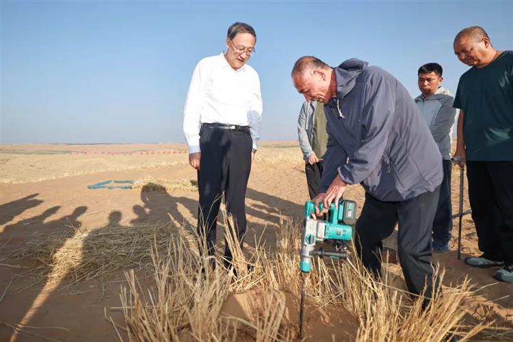 7月2日,李邑飞在腾格里沙漠锁边固沙示范点,察看荒漠化治理。