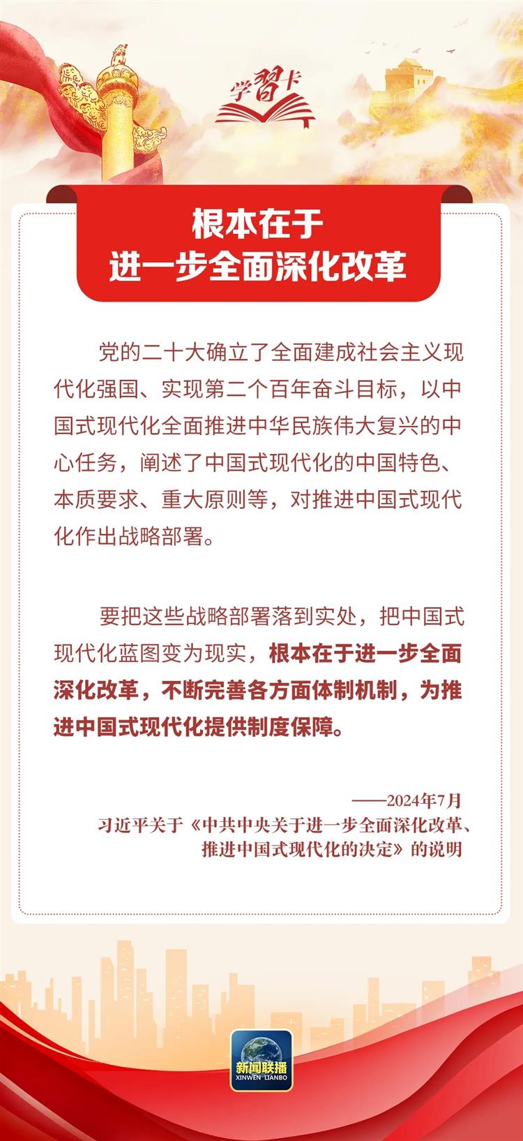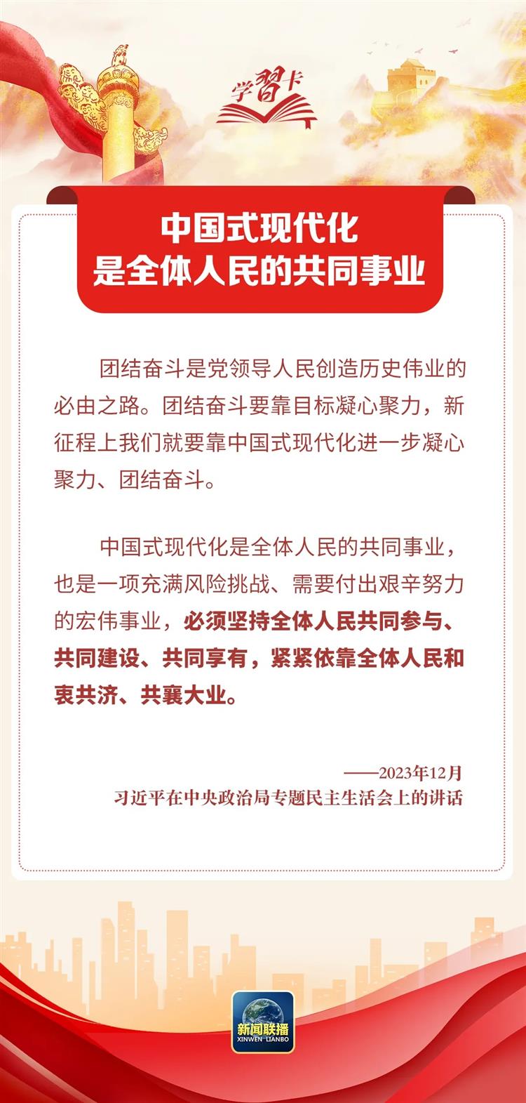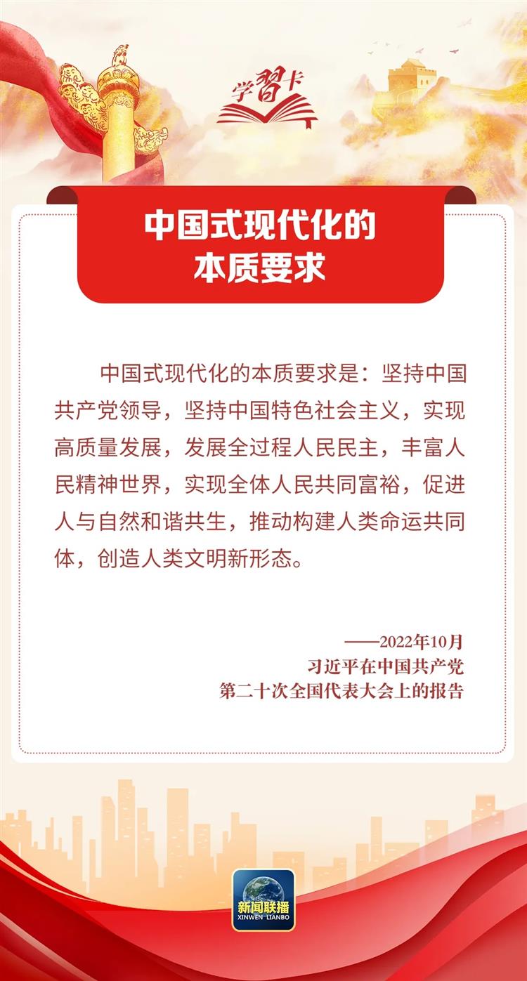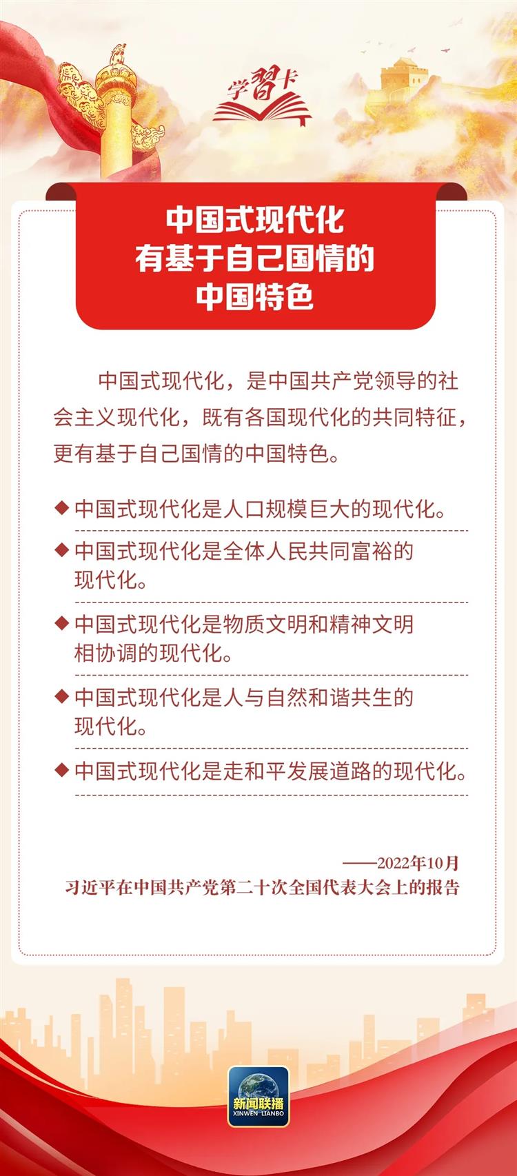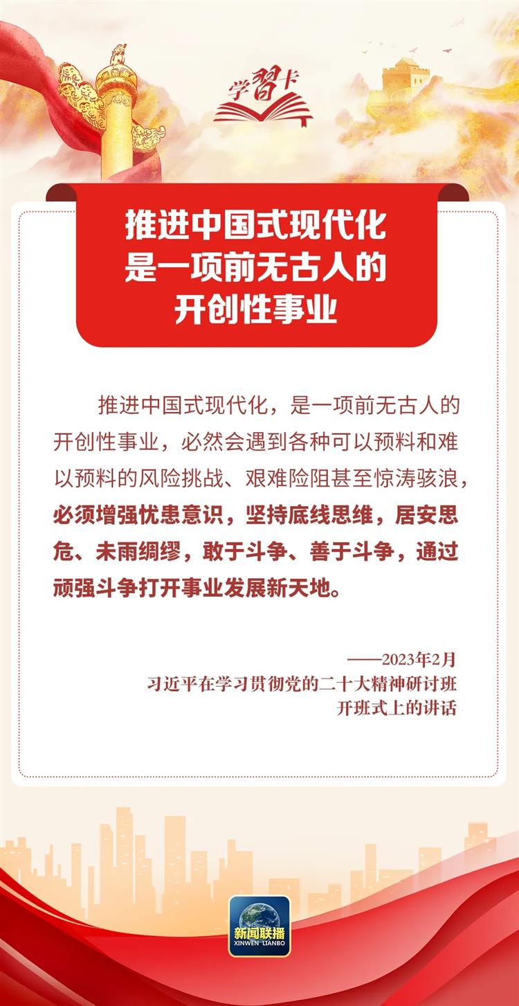 | | 学习卡丨习近平:把这一前无古人的伟大事业不断推向前进 | | 来源:央视新闻客户端 发布时间:2024-10-08 | 一个国家选择什么样的现代化道路,是由其历史传统、社会制度、发展条件、外部环境等诸多因素决定的。习近平总书记在庆祝中华人民共和国成立75周年招待会上强调,以中国式现代化全面推进强国建设、民族复兴,是新时代新征程党和国家的中心任务。庆祝共和国华诞的最好行动,就是把这一前无古人的伟大事业不断推向前进。在庆祝中华人民共和国成立75周年之际,让我们重温习近平总书记关于中国式现代化的重要论述,一起学习↓↓↓ | | 上一条:我爱你,中国! 下一条:学习进行时丨学习习近平文化思想,重温“七个着力” |