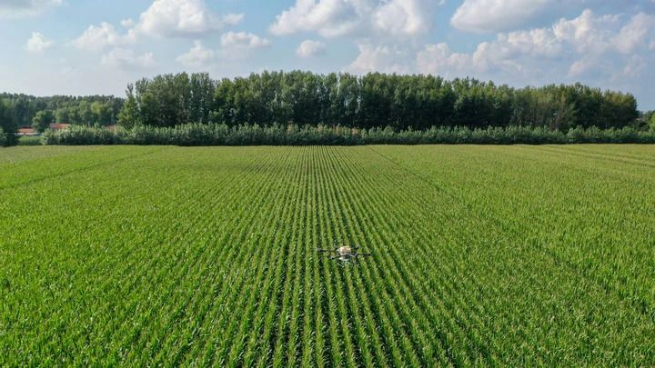 2024年8月8日,在吉林省梨树县孤家子镇,无人机为作物施肥(无人机照片)。新华社记者 张楠 摄 2020年7月,吉林省梨树县。顶着烈日,习近平总书记步入玉米地深处,走到黑土断面观测点近距离察看黑土?;で榭?。