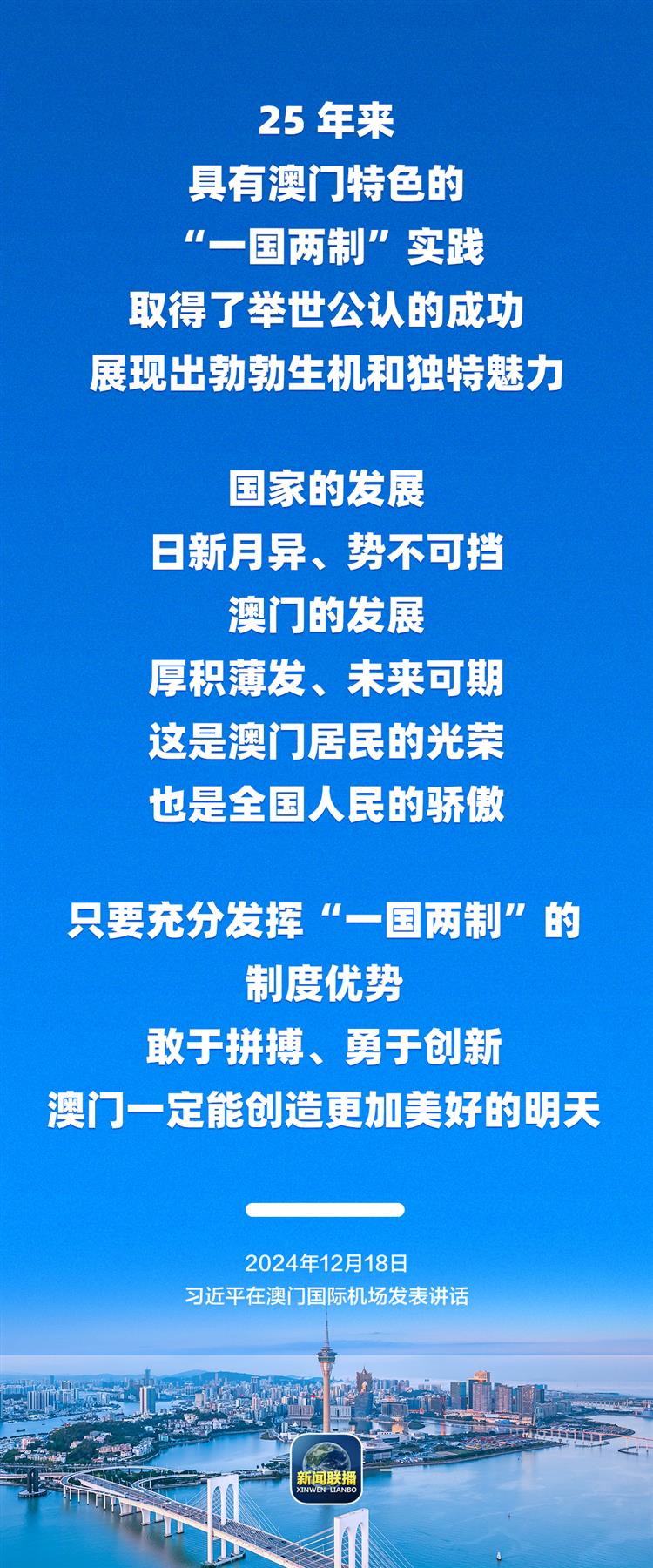 | | 习近平抵达澳门 将出席庆祝澳门回归祖国25周年大会 | | 来源:新闻联播微信 发布时间:2024-12-19 | 习近平抵达澳门 澳门特别行政区行政长官贺一诚等前往机场迎接中共中央总书记、国家主席、中央军委主席习近平18日下午乘专机抵达澳门,出席将于20日举行的庆祝澳门回归祖国25周年大会暨澳门特别行政区第六届政府就职典礼并视察澳门。16时许,习近平乘坐的专机徐徐降落在澳门国际机场。习近平和夫人彭丽媛走出舱门,向欢迎人群挥手致意。澳门警察乐队奏响热情洋溢的欢迎曲,舞龙舞狮表演喜气欢腾。舷梯旁,两名少年儿童向习近平和彭丽媛献上鲜花。在澳门特别行政区行政长官贺一诚和夫人郑素贞陪同下,习近平和彭丽媛同前来迎接的人员亲切握手。数百名澳门青少年和各界群众代表挥动国旗、特别行政区区旗和鲜花,表达热烈的欢迎。习近平这次赴澳门受到海内外高度关注,中外记者在机场等候。习近平走到采访区,向在场记者问好。他表示,每次来到美丽的澳门,都感到十分高兴。这次来,是和同胞们一起庆祝澳门回归祖国25周年,看看澳门这几年的新发展新变化。他代表中央政府和全国各族人民,向全体澳门居民致以诚挚问候和良好祝愿。习近平指出,25年来,具有澳门特色的“一国两制”实践取得了举世公认的成功,展现出勃勃生机和独特魅力。国家的发展日新月异、势不可挡,澳门的发展厚积薄发、未来可期。这是澳门居民的光荣,也是全国人民的骄傲。只要充分发挥“一国两制”的制度优势,敢于拼搏、勇于创新,澳门一定能创造更加美好的明天。习近平强调,澳门是祖国的掌上明珠,我一直惦念着这里的发展和全体居民的福祉。接下来几天,我会走一走、看一看,同各界朋友广泛深入交流,共商澳门发展大计。中共中央政治局常委、中央办公厅主任蔡奇,中共中央政治局委员、全国人大常委会副委员长李鸿忠,中共中央政治局委员、中央军委副主席何卫东,中共中央政治局委员、国务院副总理何立峰,全国政协副主席兼秘书长王东峰等陪同人员同机抵达。中共中央港澳工作办公室、国务院港澳事务办公室主任夏宝龙先期抵达,并到机场迎接。全国政协副主席何厚铧,澳门特别行政区候任行政长官岑浩辉,澳门特别行政区现任行政、立法、司法机构负责人等前往机场迎接。中央政府驻澳门联络办公室主任郑新聪,外交部驻澳门特派员公署特派员刘显法,中国人民解放军驻澳门部队司令员于长江、政委林庆华等也到机场迎接。 | | 上一条:习近平总书记:携手续写更加精彩的澳门故事 下一条:习近平出席澳门特别行政区政府欢迎晚宴并发表重要讲话 |