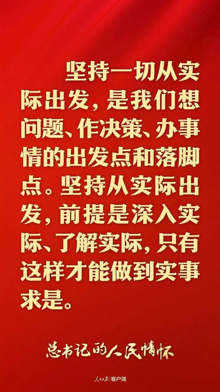 “要运用好已有的改革成果和重要经验,解放思想、实事求是、与时俱进、求真务实,充分调动各方面积极性,全力抓好改革任务的组织实施。”习近平总书记2024年8月29日在中央全面深化改革委员会第六次会议上强调。 2024年4月,习近平总书记在重庆考察时,拿“窝窝头”和“精面细面”打比喻,论述煤炭等能源行业的发展:“先吃饱肚子再吃好。我们要实事求是,既不能放慢绿色低碳发展步伐,也不能太理想化,首先要保证能源供应。” “先吃饱肚子再吃好”,其中蕴含的是一切从实际出发、实事求是的方法论。 实事求是是马克思主义的精髓,坚持一切从实际出发,是我们想问题、作决策、办事情的出发点和落脚点。2024年3月,习近平总书记在湖南考察时强调:“抓任何工作,给群众办任何事情,都要实事求是。” 坚持实事求是,基础在于搞清楚“实事”。 通过调查研究掌握实情、抓住症结、解决问题,是习近平总书记一贯的工作方式。 在地方工作时,靠着跑遍、跑深、跑透了基层,习近平同志掌握了实情、读懂了“实事”。 党的十八大以来,习近平总书记足迹遍布大江南北,以调研开路,发现问题、认识国情、寻求规律,不断丰富发展治国理政的理论和实践,也为全党重视调研、深入调研、善于调研树立了光辉典范。 坚持实事求是,关键在于“求是”,就是探求和掌握事物发展的规律。 事必有法,然后可成。习近平同志在地方工作时讲过:“领导要有水平,水平从哪里来?水平来自对客观规律的认识和掌握,而规律性的东西,正是蕴藏在广大群众的实践中。” 推动乡村产业振兴,“一个县是不是光靠一个产业去发展,要去深入调研”;推进共同富裕,“不是捆绑在一起像螃蟹一样谁也动不了,要鼓励一部分人先富起来”“先富带后富”……从群众中来、到群众中去,来去之间,是从认识规律到运用规律的转化,是习近平总书记领导推进新时代治国理政的生动实践。 2024年全国两会期间,习近平总书记深刻阐释了发展新质生产力的方法论,强调“要防止一哄而上、泡沫化,也不要搞一种模式。各地要坚持从实际出发,先立后破、因地制宜、分类指导”。 因地制宜发展新质生产力,意味着各地要把自身置于全国一盘棋中,把握发展规律、找到适合自己的发展赛道:科教创新资源富集的地方,以基础研发和核心技术支撑的新兴产业、未来产业为发展重点,进一步提升“从0到1”的创新能力;传统产业密集的地方,聚焦高新技术同传统制造业的结合,用新技术改造提升传统产业,积极促进产业高端化、智能化、绿色化……慢不得、急不得,盯准了就持续干,坚定不移、久久为功。 “有多少汤泡多少馍”“入山问樵、入水问渔”“一把钥匙开一把锁”……一次次率先垂范、言传身教,习近平总书记强调:“要坚持实事求是、求真务实,从实际出发谋划事业和工作,使提出的点子、政策、方案符合实际情况、符合客观规律、符合科学精神,以创造性工作把党中央决策部署落到实处。” 坚持从实际出发、实事求是,不只是思想方法问题,也是党性强不强问题。如何防止“一哄而上”地盲目蛮干,如何坚持有所为有所不为,如何在一盘棋格局下实现高质量发展,桩桩件件考验的是政绩观。 习近平总书记殷殷叮嘱:“不要有大干快上的冲动,也就是不能不按规律办事,急功近利、急于出成绩。要把这种浮躁心理、急躁心态都压下来,扎扎实实、踏踏实实地搞现代化建设。” 政绩观的根本,在人民。广大党员、干部真正将人民置于心中最高位置,把为民办事、为民造福作为最重要的政绩,才能在具体工作中坚持立足实际、科学决策,坚持着眼长远、打牢基础,坚持干在实处、务求实效,从而创造经得起实践、人民、历史检验的实绩。 “我们过去取得的一切成就都是靠实事求是。今天,我们要把中国特色社会主义事业继续推向前进,还是要靠实事求是。”这是对党的成功经验的传承和发扬,这是大党大国领袖的战略清醒和战略定力。