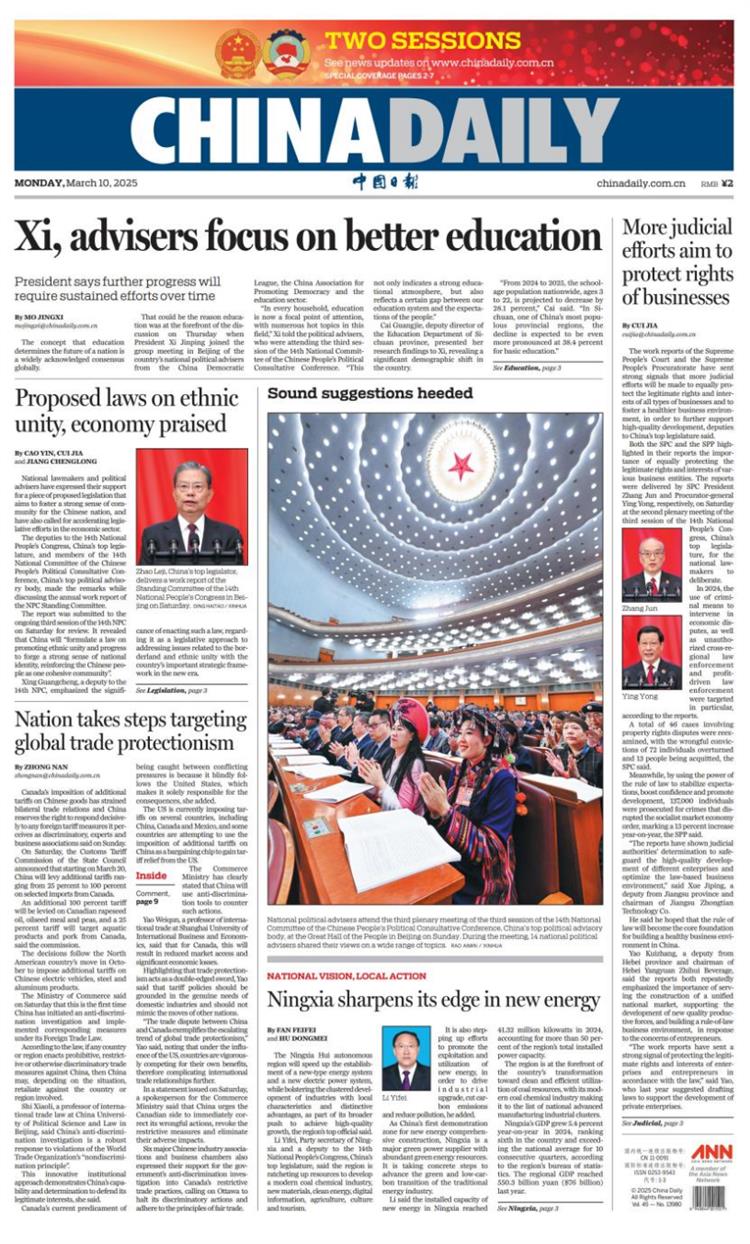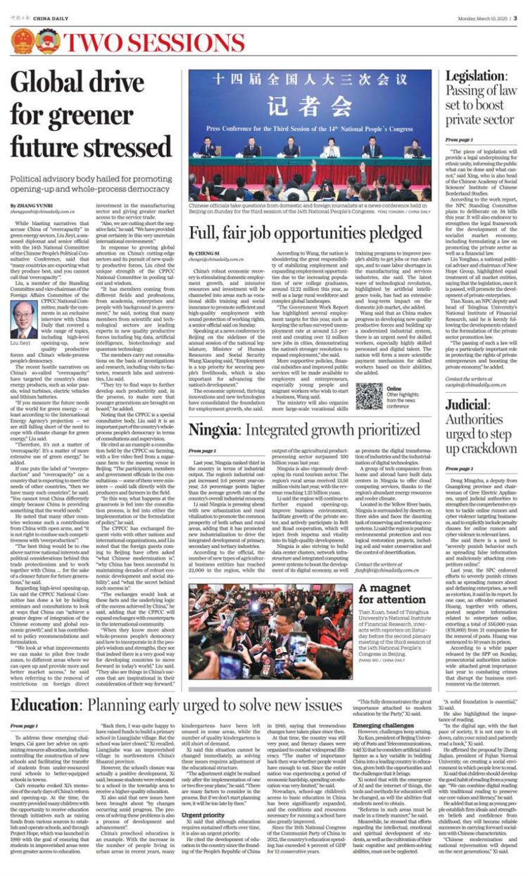 3月10日,《中国日报》头版及中国日报网首页刊发宁夏回族自治区党委书记、人大常委会主任李邑飞专访《Ningxia sharpens its edge in new energy》及中文专稿《共同团结奋斗 共同繁荣发展 凝心聚力谱写中国式现代化宁夏篇章》。文章刊发后,在海内外引起广泛关注。