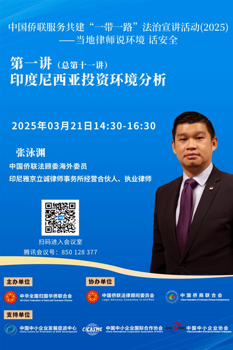 为深入学习贯彻党的二十大和二十届三中全会精神,全面落实第十一次全国归侨侨眷代表大会工作部署,围绕习近平总书记在第四次“一带一路”建设工作座谈会上的讲话精神,开展中国公民、中资机构海外风险应对法律宣传,切实为中国公民和企业在共建“一带一路”国家的安全和发展保驾护航,“中国侨联服务共建‘一带一路’——当地律师说环境 话安全”法治宣讲活动(2025)即将启动?;疃芍泄攘靼?,中国侨联法顾委、中国侨商会协办,中国中小企业发展促进中心、中国中小企业国际合作协会、中国中小企业协会支持?;疃沟玫饺ど塘拇罅χС?。 今年第一讲(总第十一讲)将于2025年3月21日(周五)14:30开播,由中国侨联法顾委海外委员印度尼西亚张泳渊律师主讲。张泳渊律师是印尼第四代华人,祖籍福建龙岩,先后毕业于印尼Azzahra大学和Pelita Harapan大学,专长为民事、刑事、能矿资源、不正当竞争及反垄断、金融、卫生、会计等,是印尼雅加达雅京立诚律师事务所经营合伙人、执业律师。2019年至2023年,张律师带领雅京立诚律所连续五年进入印尼全国 100大律所排行榜。张律师长期为在印尼的中资企业和中国公民提供法律咨询和帮助,并致力于促进印尼与中国的法学交流。张律师于2018年受聘为中国侨联法顾委海外委员,于2019年担任印尼就业法典的备案审查专家,于2021年担任印尼金属和煤炭矿业法操作细则的备案审查专家,同时担任印尼律师协会维护律师权益部副部长、印尼能矿律师协会律师维权权益部长。 今年第一讲(总第十一讲)听课链接参见下方海报,敬请关注!