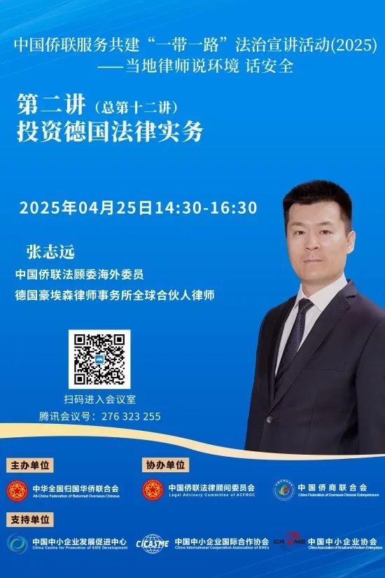 为深入学习贯彻党的二十大和二十届三中全会精神,全面落实第十一次全国归侨侨眷代表大会工作部署,围绕习近平总书记在第四次“一带一路”建设工作座谈会上的讲话精神,开展中国公民、中资机构海外风险应对法律宣传,切实为中国公民和企业在共建“一带一路”国家的安全和发展保驾护航,由中国侨联主办,中国侨联法顾委、中国侨商会协办,中国中小企业发展促进中心、中国中小企业国际合作协会、中国中小企业协会支持的“中国侨联服务共建‘一带一路’——当地律师说环境 话安全”法治宣讲活动(2025)已于2025年3月21日启动。活动还得到全国工商联的大力支持。 今年第一讲(总第十一讲)中,中国侨联法顾委海外委员印度尼西亚张泳渊律师以《印度尼西亚投资环境分析》为题进行了宣讲。回放链接参见文末。 今年第二讲(总第十二讲)将于2025年4月25日(周五)14:30开播,由中国侨联法顾委海外委员德国张志远律师主讲。张志远律师先后毕业于中国政法大学和德国萨尔布吕肯大学、波恩大学,从2007年起担任德国豪埃森律师事务所全球合伙人律师。张律师的专长是中欧企业双向绿地投资、跨国并购、企业治理、企业合规及企业诉讼等。张律师还担任中国驻德国大使馆法律顾问,德国巴特洪堡应用科技大学客座法学教授,中国侨联第三届青年委员、第十届和十一届海外委员。 今年第二讲(总第十二讲)听课链接参见下方海报,敬请关注! “中国侨联服务共建‘一带一路’——当地律师说环境 话安全”法治宣讲活动于2024年3月15日首次启动,来自哈萨克斯坦、西班牙、马来西亚、南非、新加坡、新西兰、泰国、俄罗斯、墨西哥、韩国十个国家的中国侨联法顾委海外委员先后进行宣讲?;胤帕唇硬渭哪?。 第十一讲 中国侨联法顾委海外委员印度尼西亚张泳渊律师主讲《印度尼西亚投资环境分析》 回放链接: https://meeting.tencent.com/crm/NxPDOBWP5a 第一讲至第十讲回放链接: http://www.chinaql.org/GB/419631/419659/460014/index.html |