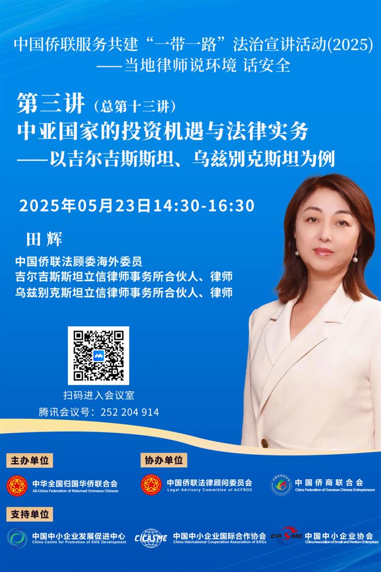 | | 中国侨联服务共建“一带一路”法治宣讲活动(2025)——当地律师说环境 话安全第三讲(总第十三讲)即将开播 | | 来源:中国侨联 发布时间:2025-05-22 | 为深入学习贯彻党的二十大和二十届三中全会精神,全面落实第十一次全国归侨侨眷代表大会工作部署,围绕习近平总书记在第四次“一带一路”建设工作座谈会上的讲话精神,开展中国公民、中资机构海外风险应对法律宣传,切实为中国公民和企业在共建“一带一路”国家的安全和发展保驾护航,由中国侨联主办,中国侨联法顾委、中国侨商会协办,中国中小企业发展促进中心、中国中小企业国际合作协会、中国中小企业协会支持的“中国侨联服务共建‘一带一路’——当地律师说环境 话安全”法治宣讲活动(2025)已于2025年3月21日启动?;疃沟玫饺ど塘拇罅χС?。今年第一讲(总第十一讲)中,中国侨联法顾委海外委员印度尼西亚张泳渊律师以《印度尼西亚投资环境分析》为题进行了宣讲。今年第二讲(总第十二讲)中,中国侨联法顾委海外委员德国张志远律师以《投资德国法律实务》为题进行了宣讲。以上两讲回放链接参见文末。今年第三讲(总第十三讲)将于2025年5月23日(周五)14:30开播,由中国侨联法顾委海外委员吉尔吉斯斯坦田辉律师主讲。田辉律师毕业于北京外国语学院俄语系,1996年前往独联体国家留学,毕业于莫斯科企法学院(吉尔吉斯)法学专业,获得吉尔吉斯共和国政府下属国家法学院硕士学位,现为吉尔吉斯斯坦立信律师事务所合伙人、乌兹别克斯坦立信律师事务所合伙人,曾兼任吉尔吉斯共和国政府下属国家法学院客座教授、吉尔吉斯共和国贾拉拉巴德州州长顾问等职,现兼任吉尔吉斯斯坦中国总商会法律顾问。田律师在独联体国家工作近三十年,曾从事法律服务、招商引资、企业经营管理等工作,具有丰富的独联体市场开拓和经营管理经验,通晓独联体各国法律和市场规则,常年为在中亚的中资企业提供法律咨询和法律实务服务。今年第三讲(总第十三讲)听课链接参见下方海报,敬请关注!“中国侨联服务共建‘一带一路’——当地律师说环境 话安全”法治宣讲活动于2024年3月15日首次启动,来自哈萨克斯坦、西班牙、马来西亚、南非、新加坡、新西兰、泰国、俄罗斯、墨西哥、韩国十个国家的中国侨联法顾委海外委员先后进行宣讲。回放链接参见文末。第十一讲 中国侨联法顾委海外委员印度尼西亚张泳渊律师主讲《印度尼西亚投资环境分析》https://meeting.tencent.com/crm/NxPDOBWP5a第十二讲 中国侨联法顾委海外委员德国张志远律师主讲《投资德国法律实务》https://meeting.tencent.com/crm/2YXb6MjR07http://www.chinaql.org/GB/419631/419659/460014/index.html | | 上一条:防灾减灾宣传周,来了! 下一条:使用AI应用保密安全指南 |