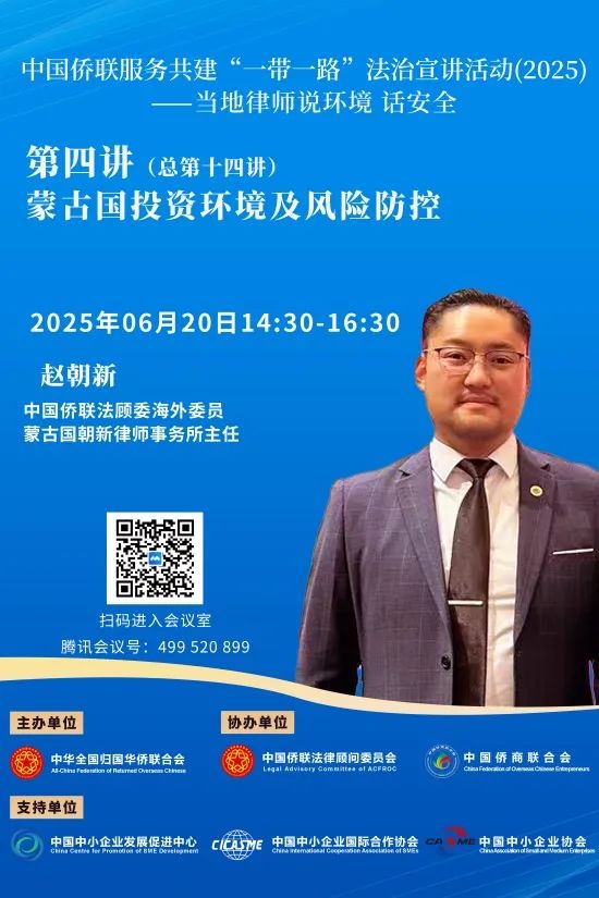 为深入学习贯彻党的二十大和二十届三中全会精神,全面落实第十一次全国归侨侨眷代表大会工作部署,围绕习近平总书记在第四次“一带一路”建设工作座谈会上的讲话精神,开展中国公民、中资机构海外风险应对法律宣传,切实为中国公民和企业在共建“一带一路”国家的安全和发展保驾护航,由中国侨联主办,中国侨联法顾委、中国侨商会协办,中国中小企业发展促进中心、中国中小企业国际合作协会、中国中小企业协会支持的“中国侨联服务共建‘一带一路’——当地律师说环境 话安全”法治宣讲活动(2025)于2025年3月21日启动?;疃沟玫饺ど塘拇罅χС?。 今年第一讲(总第十一讲)中,中国侨联法顾委海外委员印度尼西亚张泳渊律师以《印度尼西亚投资环境分析》为题进行了宣讲。今年第二讲(总第十二讲)中,中国侨联法顾委海外委员德国张志远律师以《投资德国法律实务》为题进行了宣讲。今年第三讲(总第十三讲)中,中国侨联法顾委海外委员吉尔吉斯斯坦田辉律师以《中亚国家的投资机遇与法律实务——以吉尔吉斯斯坦、乌兹别克斯坦为例》为题进行了宣讲。以上三讲回放链接参见文末。 今年第四讲(总十四讲)将于2025年6月20日(周五)14:30开播,由中国侨联法顾委海外委员蒙古国赵朝新律师主讲。赵朝新律师1991年出生于蒙古国乌兰巴托市,2013年毕业于中国暨南大学法学院,后在蒙古国国家行政管理学院进修政府法务管理,是蒙古国目前唯一一位获得律师资格证的中国公民。赵律师曾担任蒙古国中国和平统一促进会、蒙古国浙江商会和多家中资企业的法律顾问,2021年创立了蒙古国朝新律师事务所。该律所是蒙古国目前唯一一家由中国公民100%持股、具有从事蒙古国相关法律业务资格的本土律师事务所,为在蒙古国的中国公民和从事矿业、生产业、建筑业、销售业、金融业等领域的中资企业提供专业、优质的法律服务。 今年第四讲(总第十四讲)收看链接参见下方海报,敬请关注! “中国侨联服务共建‘一带一路’——当地律师说环境 话安全”法治宣讲活动于2024年3月15日首次启动,来自哈萨克斯坦、西班牙、马来西亚、南非、新加坡、新西兰、泰国、俄罗斯、墨西哥、韩国十个国家的中国侨联法顾委海外委员先后进行宣讲。回放链接参见文末。 第十一讲 中国侨联法顾委海外委员印度尼西亚张泳渊律师主讲《印度尼西亚投资环境分析》 回放链接: https://meeting.tencent.com/crm/NxPDOBWP5a 第十二讲 中国侨联法顾委海外委员德国张志远律师主讲《投资德国法律实务》 回放链接: https://meeting.tencent.com/crm/2YXb6MjR07 第十三讲 中国侨联法顾委海外委员吉尔吉斯斯坦田辉律师主讲《中亚国家的投资机遇与法律实务 ——以吉尔吉斯斯坦、乌兹别克斯坦为例》 回放链接: https://meeting.tencent.com/crm/24LdjWdme5 第一讲至第十讲回放链接: http://www.chinaql.org/GB/419631/419659/460014/index.html |