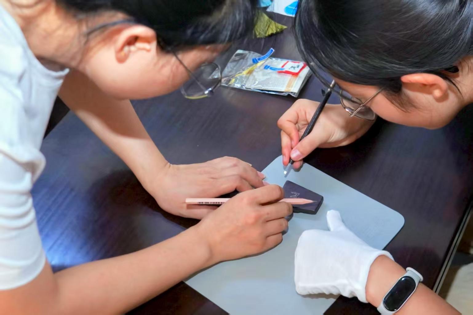 8月5日,2025“亲情中华·中国寻根之旅”夏令营宁夏营在银川市闭营。闭营前,来自美国、德国、法国、比利时、沙特阿拉伯的50名海外华裔青少年营员及领队在银川文化城凤凰幻城沉浸式体验非遗贺兰石雕刻,为本次“寻根之旅”画上圆满的句号。 贺兰石雕刻体验室内,营员们手持刻刀,在非遗传承人的指导下,将贺兰山岩画元素融入作品,感受“石上史诗”的魅力。来自沙特智慧宫中文教育学院的马睿涵告诉记者:“这是我第一次尝试做贺兰石雕刻,雕刻的过程手很酸,但看到自己设计的作品就觉得很值得。” 营员们通过实地参观学习,领悟了中国传统服饰及礼仪之美,近距离观赏了贺兰山岩画,并在沙坡头亲近自然。闭营仪式上,营员们展示了剪纸、书法等学习成果,用歌声与舞蹈再现旅途中的文化碰撞。“这次夏令营让孩子们沉浸式感受了中华文化的多元魅力??吹胶⒆用茄壑械暮闷嬗胄朔?,我也很欣慰。希望他们能把宁夏的故事带回海外,做中华文化的小小传播者。”沙特智慧宫中文教育学院领队董玲说。 非遗传承人向学员们教授贺兰石的基本知识。