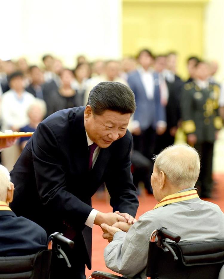 2015年9月2日,习近平总书记在北京人民大会堂向30名抗战老战士老同志、抗战将领、帮助和支持中国抗战的国际友人或其遗属代表颁发中国人民抗日战争胜利70周年纪念章并发表重要讲话。新华社记者 李学仁 摄