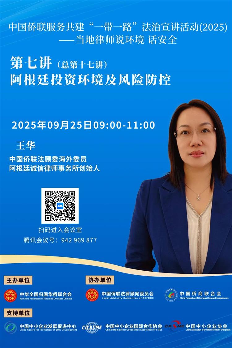 为深入学习贯彻党的二十大和二十届三中全会精神,全面落实第十一次全国归侨侨眷代表大会工作部署,围绕习近平总书记在第四次“一带一路”建设工作座谈会上的讲话精神,开展中国公民、中资机构海外风险应对法律宣传,切实为中国公民和企业在共建“一带一路”国家的安全和发展保驾护航,由中国侨联主办,中国侨联法顾委、中国侨商会协办,中国中小企业发展促进中心、中国中小企业国际合作协会、中国中小企业协会支持的“中国侨联服务共建‘一带一路’——当地律师说环境 话安全”法治宣讲活动(2025)于2025年3月21日启动?;疃沟玫饺ど塘拇罅χС帧?/span> 今年前六讲(总第十一至第十六讲)中,来自印度尼西亚、德国、吉尔吉斯斯坦、蒙古国、澳大利亚、柬埔寨的中国侨联法顾委海外委员对所在国投资环境、风险防范要点及典型案例等进行了宣讲。以上六讲回放链接参见文末。今年第七讲(总第十七讲)将于2025年9月25日(周四)9:00开播,由中国侨联法顾委海外委员阿根廷王华律师主讲。王律师毕业于阿根廷美洲大学,获得国际贸易硕士学位,持有律师执照和阿根廷国家公认中西文翻译资格证。王律师专注于公司法、海关法、国际贸易和移民法等,近年来在中资企业投标、重组、并购、索赔、公证等方面提供全方位法律服务,助力中资企业“走出去”。王律师还同时兼任阿根廷华侨华人妇女联合总会会长、中国驻阿根廷大使馆领事部法律顾问、阿根廷布宜诺斯艾利斯大学法学院特聘教授等职务。今年第七讲(总第十七讲)收看链接参见下方海报,敬请关注!“中国侨联服务共建‘一带一路’——当地律师说环境 话安全”法治宣讲活动于2024年3月15日首次启动,来自哈萨克斯坦、西班牙、马来西亚、南非、新加坡、新西兰、泰国、俄罗斯、墨西哥、韩国十个国家的中国侨联法顾委海外委员先后进行宣讲?;胤帕唇硬渭哪?/span>第十一讲 中国侨联法顾委海外委员印度尼西亚张泳渊律师主讲《印度尼西亚投资环境分析》https://meeting.tencent.com/crm/NxPDOBWP5a第十二讲 中国侨联法顾委海外委员德国张志远律师主讲《投资德国法律实务》https://meeting.tencent.com/crm/2YXb6MjR07第十三讲 中国侨联法顾委海外委员吉尔吉斯斯坦田辉律师主讲《中亚国家的投资机遇与法律实务https://meeting.tevncent.com/crm/24LdjWdme5第十四讲 中国侨联法顾委海外委员蒙古国赵朝新律师主讲《蒙古国投资环境及风险防控》https://meeting.tencent.com/crm/2965MBzq92第十五讲 中国侨联法顾委海外委员澳大利亚蔡庆伟律师主讲《走进澳大利亚:投资环境与风范管理》https://meeting.tencent.com/crm/Noq6dLk5ad第十六讲 中国侨联法顾委海外委员柬埔寨黄智贤律师主讲《柬埔寨法律法规体系与投资环境》https://meeting.tencent.com/crm/l7qMYjME8dhttp://www.chinaql.org/GB/419631/419659/460014/index.html |